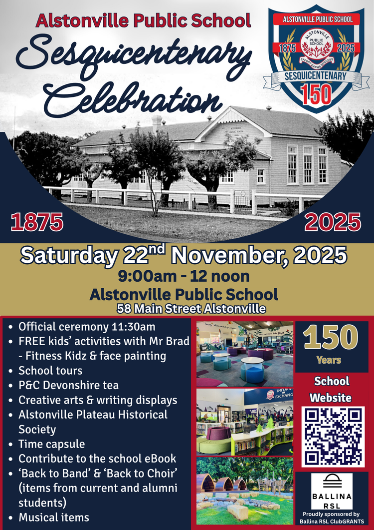 We are celebrating 150 years of Alstonville Public School with the community! Please feel free to pop on by and enjoy the display we have been working hard on showing everyone